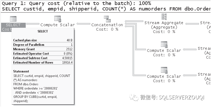 这个语句查询得到所有可能的聚合值,聚合属性是custid,empid,shipperid。如图1