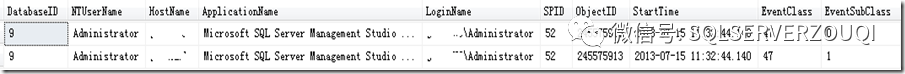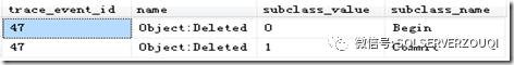 这一步中就得到了谁删除了这个表的更具体信息了。需要说明一下的是EventClass=47,EventSubclass=(0,1),这记录了跟踪事件的操作。