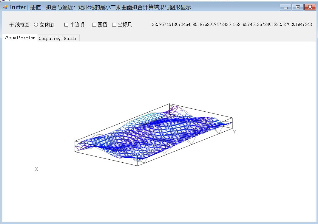 以矩形域最小二乘曲面拟合为例,下图的三维显示核心没有openGL,完全是自主知识产权的,拟合的结果实际上是一个六维曲面。