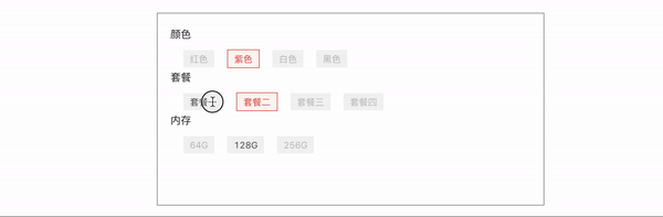 近来在掘金上面看见大家都在研究“商品多规格选择”的问题,例如晨曦大佬的前端电商 sku 的全排列算法很难吗?学会这个套路,彻底掌握排列组合。在这篇文章里面,大佬写明了如何实现sku的全排列,思路非常的棒,但是并没有紧贴业务场景。真正的业务场景是,我们要根据用户每一次选择的规格,找出剩下可选的规格和不可选的规格,表现在前端页面上:就是将不可选的规格置回,也就是如下效果(可以点击这里查看最终效果):