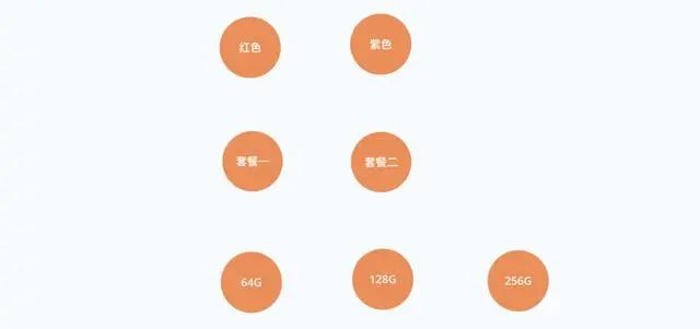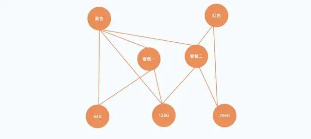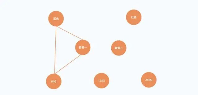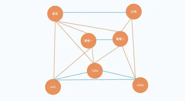 假设用户先选择了紫色、根据specCombinationList,我们发现套餐一、套餐二、64G、128G是可选的,这个时候我们发现一个问题:显然跟紫色同级的红色其实也是可选的。所以这个图其实我们还没有画完。所以相同类型的规格其实是应该连接起来的: