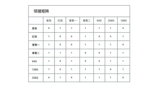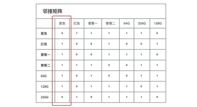 首先,我们根据specList知道:我们有“颜色”、“套餐”、“内存”三种规格类别。分别有红色、紫色、套餐一、套餐二、64G、128G、256G这些单项规格。每个单项规格作为一个顶点,所以就有如下顶点: