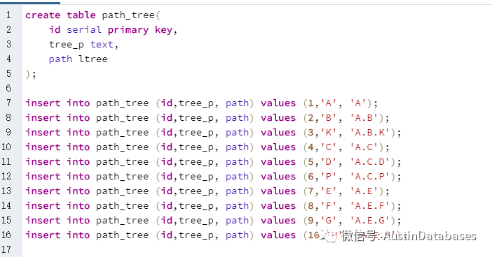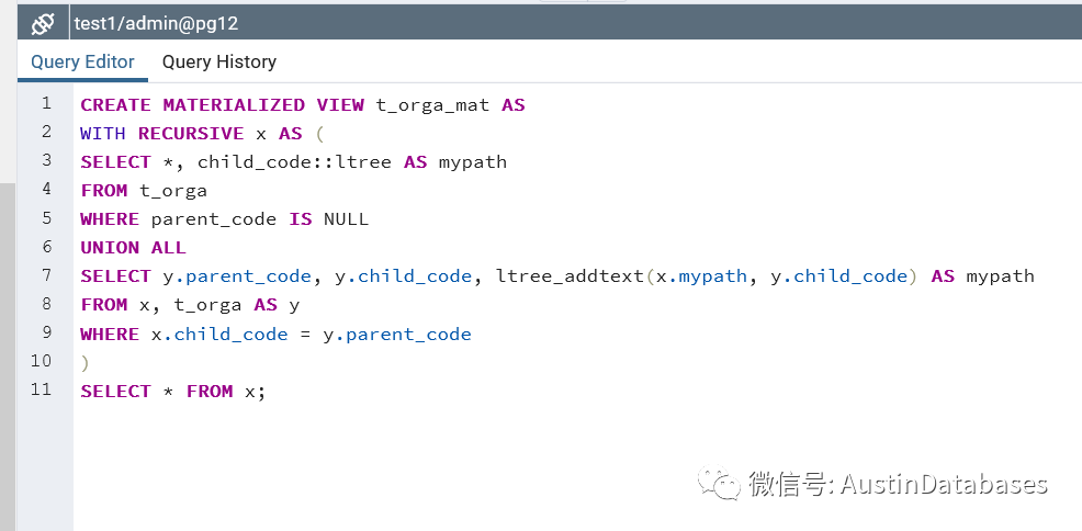 大家会注意到虽然上边建表并未使用到LTREE 类型,但实际上在物化视图中已经使用ltree 类型, 否则后面将无法通过LTREE 形式进行查询。