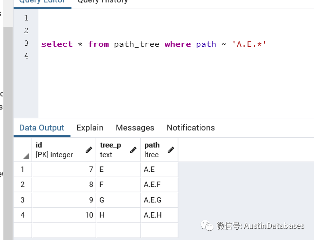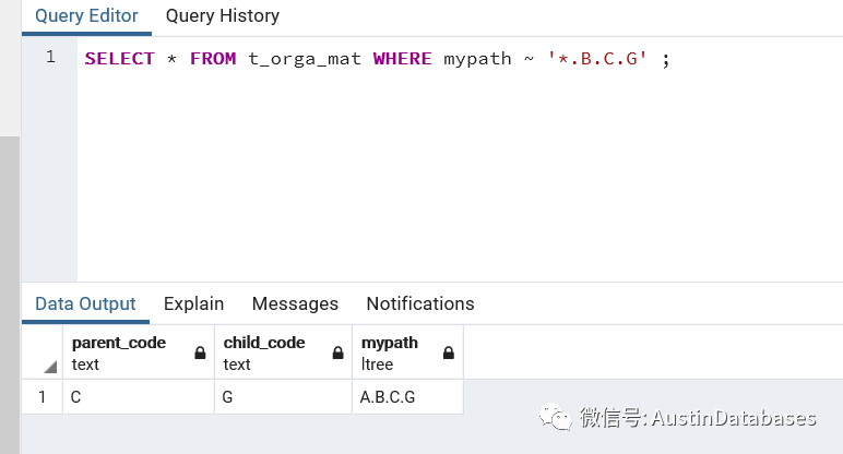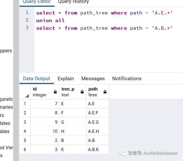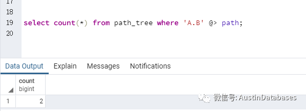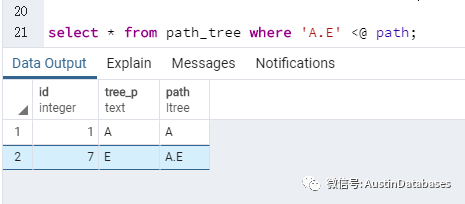 上图动用了一个新的字段类型ltree , ltree 本身就是使用树形结构的来进行数据的存储, 我们在输入了数据后,就可以开始查询了, 例如我们想知道当前树形结构包含 A.B 的树形路径 通过 LTREE 自身的操作符号
