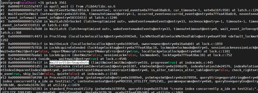 从上面可以看到索引创建在等待虚拟事务ID的释放,进一步通过pg_locks视图可以找到持有该锁的进程。postgres=#select relation,virtualxid,virtualtransaction,granted,pid from pg_locks where pid = 3561;