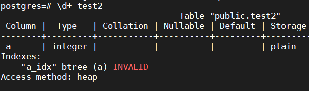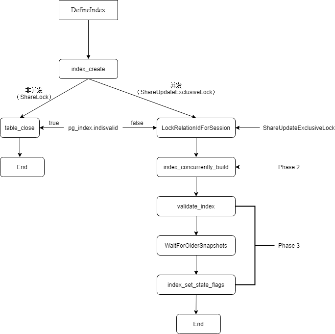 对应前面的session2操作,如果需要了解这其中的具体原因,需要仔细阅读索引创建函数DefineIndex,了解其中操作过程,下面给出整理的大致流程和等待进程的调用栈信息。 结合堆栈和流程图,可以看到,阻塞发生在第三阶段上,等待其他事务完成,是不是所有的事务都会阻塞呢?答案是否定的,索引创建的过程不是和所有事务都会阻塞,可以参考GetCurrentVirtualXIDs函数实现。 如果强制结束前面的索引创建进程,根据前面的流程图,该索引实际上已经记录在系统表中,只是状态标记为invalid,如下 如果发生这种情况,索引是无法使用到的,但是仍然会插入相关数据,影响更改的性能,需要重建该索引或者删除该索引后重新创建,手册说明如下: | If a problem arises while scanning the table, such as a deadlock or a uniqueness violation in a unique index, the CREATE INDEX command will fail but leave behind an “invalid” index. This index will be ignored for querying purposes because it might be incomplete; however it will still consume update overhead.The recommended recovery method in such cases is to drop the index and try again to perform CREATE INDEX CONCURRENTLY. (Another possibility is to rebuild the index with REINDEX INDEX CONCURRENTLY). |