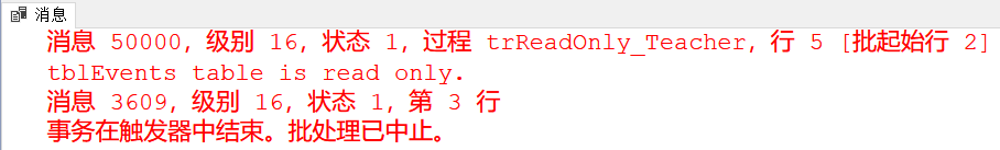 CREATE TRIGGER trReadOnly_Teacher ON Teacher INSTEAD OF INSERT,UPDATE,DELETE AS BEGIN RAISERROR( 'tblEvents table is read only.',16, 1 ) ROLLBACK TRANSACTION END