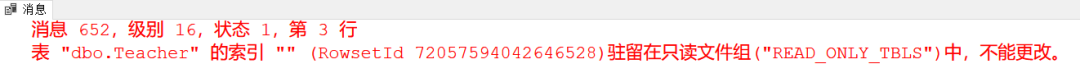 CREATE TABLE Teacher(TID VARCHAR(10),TName varchar(100))ON [READ_ONLY_TBLS]INSERT INTO TeacherSELECT * FROM #Teacher--将数据库的文件组设为只读ALTER DATABASE School MODIFY FILEGROUP[READ_ONLY_TBLS] READONLY