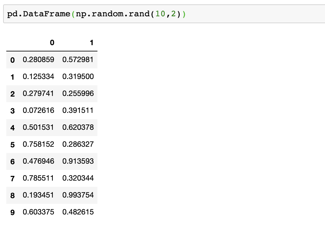 在Pandas中可以结合NumPy生成由指定随机数(均匀分布、正态分布等)生成的矩阵,例如同样生成10*2的0—1均匀分布随机数矩阵为,使用一行代码即可:pd.DataFrame(np.random.rand(10,2))