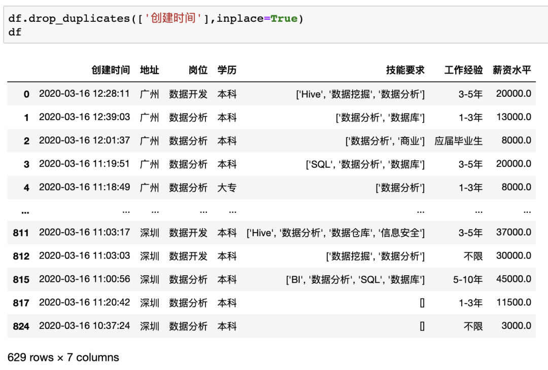 在pandas中可以使用drop_duplicates来对数据进行去重,并且可以指定列以及保留顺序,例如对示例数据按照创建时间列进行去重df.drop_duplicates(['创建时间'],inplace=True),可以发现和Excel处理的结果一致,保留了 629 个唯一值。