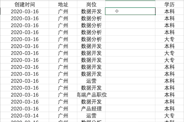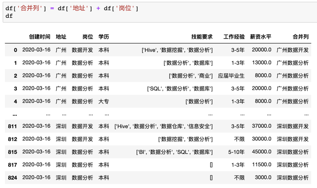 在Pandas中合并多列比较简单,类似于之前的数据插入操作,例如合并示例数据中的地址+岗位列使用df['合并列'] = df['地址'] + df['岗位']