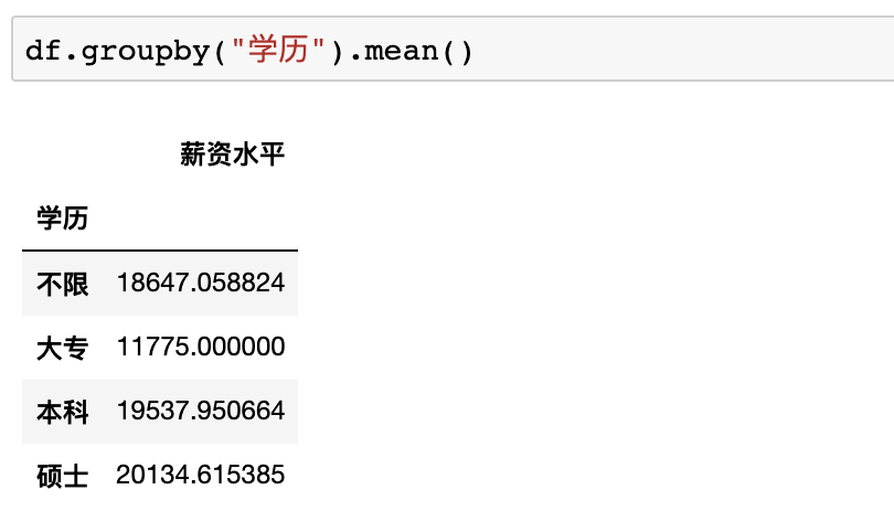 在Pandas中对数据进行分组计算可以使用groupby轻松搞定,比如使用df.groupby("学历").mean()一行代码即可对示例数据的学历进行分组并求不同学历的平均薪资,结果与Excel一致