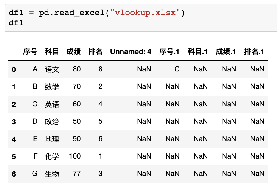 在Pandas中没有现成的vlookup函数,所以实现匹配查找需要一些步骤,首先我们读取该表格
