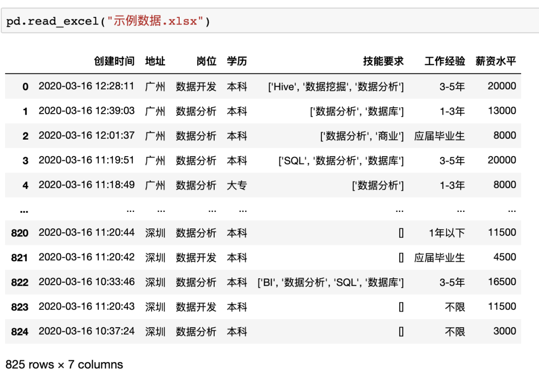 Pandas支持读取本地Excel、txt文件,也支持从网页直接读取表格数据,只用一行代码即可,例如读取上述本地Excel数据可以使用pd.read_excel("示例数据.xlsx")