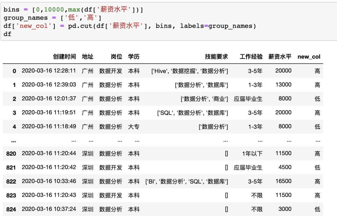 bins = [0,10000,max(df['薪资水平'])]group_names = ['低','高']df['new_col'] = pd.cut(df['薪资水平'], bins, labels=group_names)