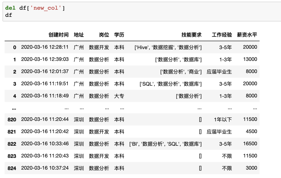 在pandas中删除数据也很简单,比如删除最后一列使用del df['new_col']