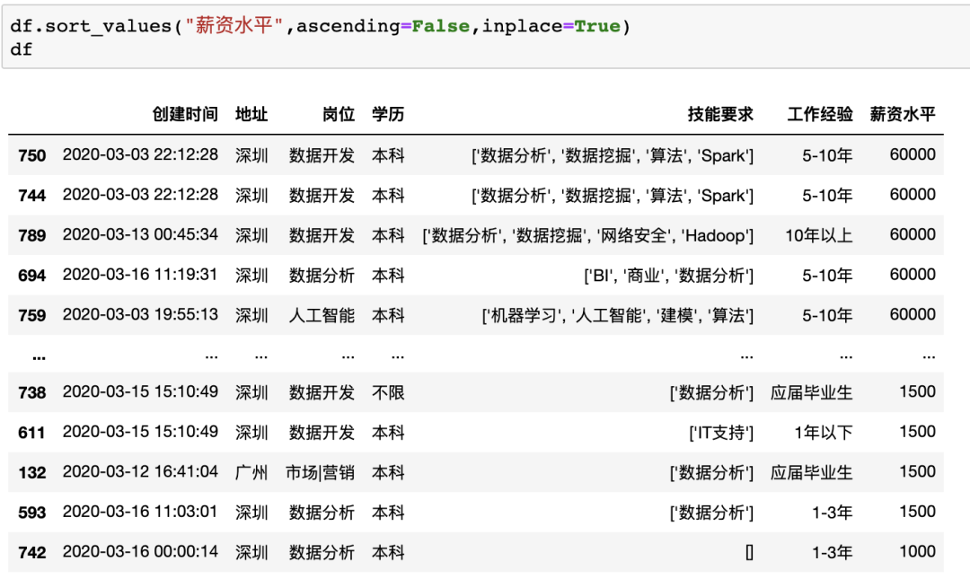 来控制升降序,例如将示例数据按照薪资从高到低进行排序可以使用df.sort_values("薪资水平",ascending=False,inplace=True)