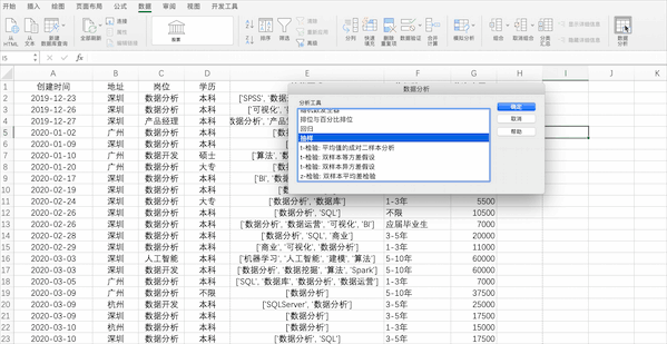 在Excel中有很多统计相关的公式,也有现成的分析工具,比如对薪资水平列进行描述性统计分析,可以通过添加工具库之后点击数据分析按钮并设置相关参数