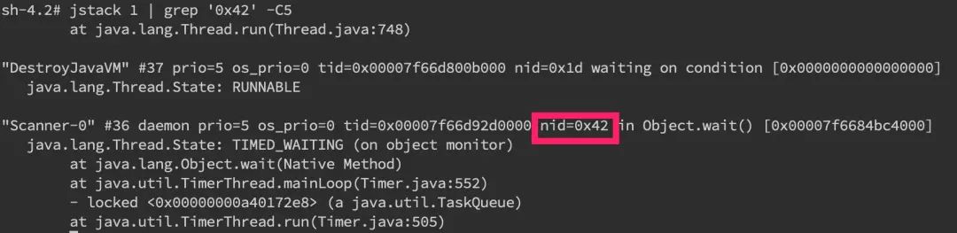 接着直接在 jstack 中找到相应的堆栈信息jstack pid |grep 'nid' -C5 –color