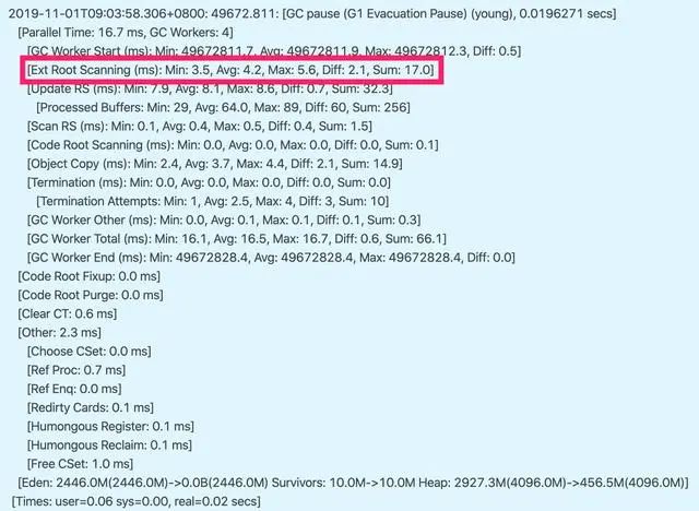 堆内内存泄漏总是和 GC 异常相伴。不过 GC 问题不只是和内存问题相关,还有可能引起 CPU 负载、网络问题等系列并发症,只是相对来说和内存联系紧密些,所以我们在此单独总结一下 GC 相关问题。我们在 CPU 章介绍了使用 jstat 来获取当前 GC 分代变化信息。而更多时候,我们是通过 GC 日志来排查问题的,在启动参数中加上-verbose:gc -XX:+PrintGCDetails -XX:+PrintGCDateStamps -XX:+PrintGCTimeStamps来开启 GC 日志。常见的 Young GC、Full GC 日志含义在此就不做赘述了。针对 gc 日志,我们就能大致推断出 youngGC 与 fullGC 是否过于频繁或者耗时过长,从而对症下药。我们下面将对 G1 垃圾收集器来做分析,这边也建议大家使用 G1-XX:+UseG1GC。youngGC 频繁一般是短周期小对象较多,先考虑是不是 Eden 区/新生代设置的太小了,看能否通过调整-Xmn、-XX:SurvivorRatio 等参数设置来解决问题。如果参数正常,但是 young gc 频率还是太高,就需要使用 Jmap 和 MAT 对 dump 文件进行进一步排查了。耗时过长问题就要看 GC 日志里耗时耗在哪一块了。以 G1 日志为例,可以关注 Root Scanning、Object Copy、Ref Proc 等阶段。Ref Proc 耗时长,就要注意引用相关的对象。Root Scanning 耗时长,就要注意线程数、跨代引用。Object Copy 则需要关注对象生存周期。而且耗时分析它需要横向比较,就是和其他项目或者正常时间段的耗时比较。比如说图中的 Root Scanning 和正常时间段比增长较多,那就是起的线程太多了。
