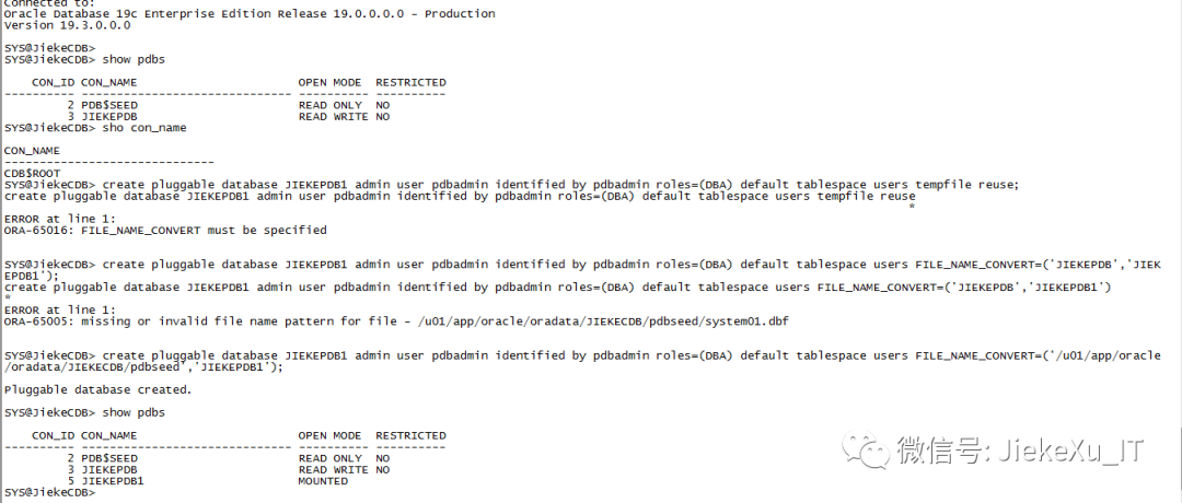 SYS@JIEKECDB> alter pluggable database JIEKEPDB1 open;SYS@JIEKECDB> show pdbs CON_ID CON_NAME OPEN MODE RESTRICTED---------- ------------------------------ ---------- ---------- 2 PDB$SEED READ ONLY NO 3 JIEKEPDB READ WRITE NO 5 JIEKEPDB1 READ WRITE NO--注意 CON_ID 没有出现 4 是由于前面创建出现错误导致。