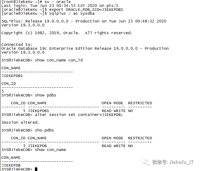 不可以使用 export ORACLE_SID=JIEKEPDB1 的方式连接 PDB,因为实例只有一个,对应的 SID 是 JiekeCDB,不存在 Jiekepdb1 实例。但是 18c 、19c 可以使用 ORACLE_PDB_SID 来连接到 PDB,直接登录到数据库。