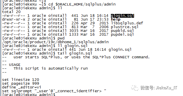 如上图,当我使用 sqlplus 连接到 PDB 时,每行 SQL 前均会显示所连接到的容器租户以及用户名称,如 SYS@JIEKEPDB1> .这个命令提示符是可以配置的。在 $ORACLE_HOME/sqlplus/admin 目录下有一个 glogin.sql 文件,在最后添加 sqlprompt 相关的提示便可以了。