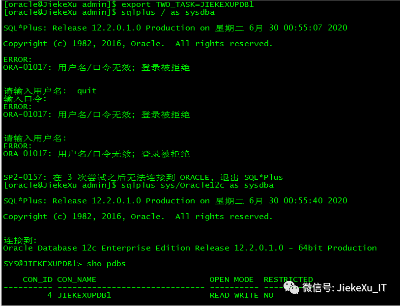 [oracle@JiekeXu admin]$ export ORACLE_PDB_SID=JIEKEXUPDB[oracle@JiekeXu admin]$ sqlplus as sysdbaSQL*Plus: Release 12.2.0.1.0 Production on 星期二 6月 23 09:15:52 2020Copyright (c) 1982, 2016, Oracle. All rights reserved.连接到:Oracle Database 12c Enterprise Edition Release 12.2.0.1.0 - 64bit ProductionSYS@JiekeXu> show pdbs CON_ID CON_NAME OPEN MODE RESTRICTED---------- ------------------------------ ---------- ---------- 2 PDB$SEED READ ONLY NO 3 JIEKEXUPDB READ WRITE NO 4 JIEKEXUPDB1 READ WRITE NOSYS@JiekeXu> show con_nameCON_NAME------------------------------CDB$ROOT