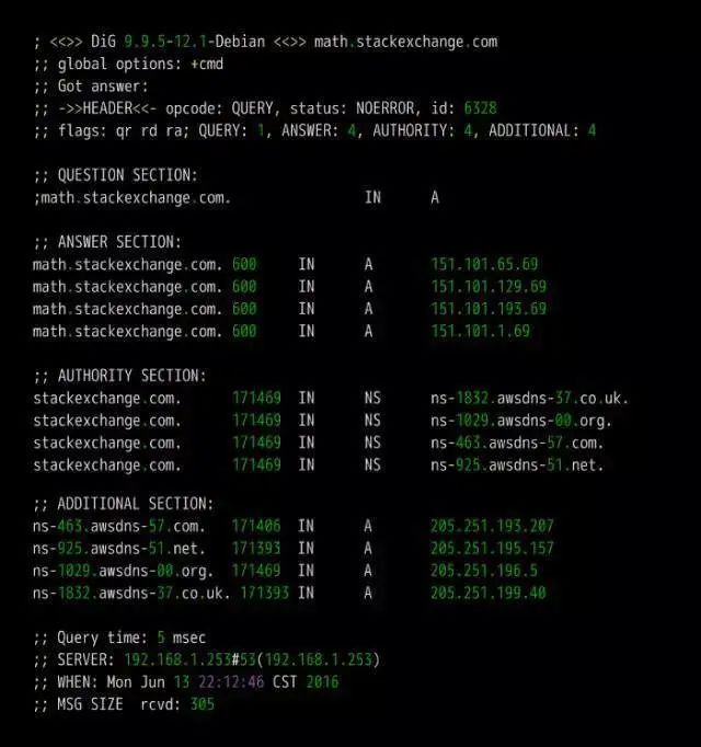 上面结果表示,查询域名math.stackexchange.com的A记录,A是address的缩写。