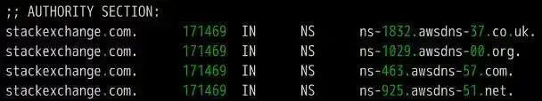 第四段显示stackexchange.com的NS记录(Name Server的缩写),即哪些服务器负责管理stackexchange.com的DNS记录。