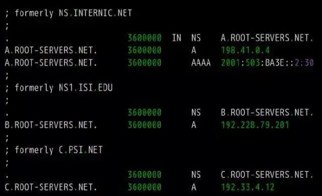 上面列表中,列出了根域名(.root)的三条NS记录A.ROOT-SERVERS.NET、B.ROOT-SERVERS.NET和C.ROOT-SERVERS.NET,以及它们的IP地址(即A记录)198.41.0.4、192.228.79.201、192.33.4.12。