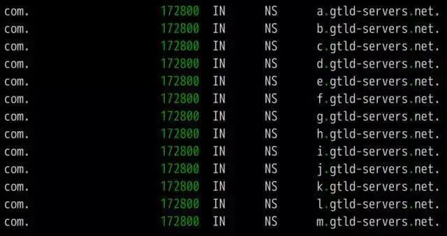 上面结果显示.com域名的13条NS记录,同时返回的还有每一条记录对应的IP地址。