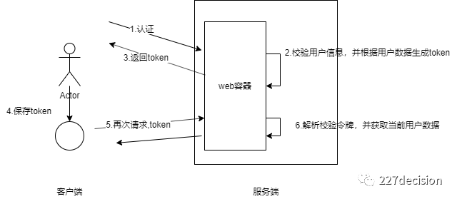它的交互流程是,用户认证成功后,服务端生成一个token发给客户端,客户端可以放到cookie或localStorage等存储中,每次请求带上token,服务端收到token通过验证后即可确认用户身份。流程图如下: