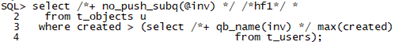 2、通过提示PUSH_SUBQ/NO_PUSH_SUBQ对优化的子查询转换进行控制,不使用查询转换,从执行计划可见,出现了FILTER关键字,这是指执行按照T_OBJECTS和T_USERS进行了一个索引的嵌套循环,效率较低。