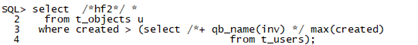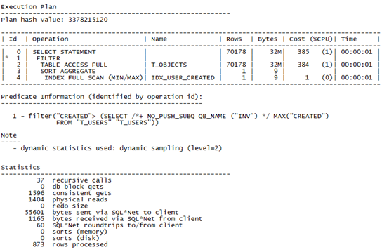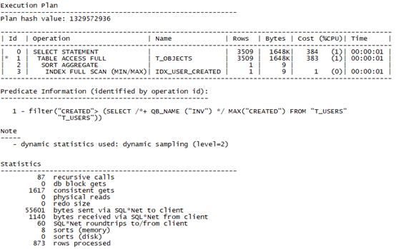 3、不使用提示,通过执行计划可看出没有出现两表嵌套,而是提前处理了子查询,先生成了MAX CREATED,然后全表扫描T_OBJECTS进行过滤,显然这种方式效率更高。