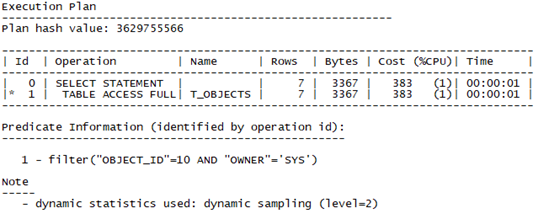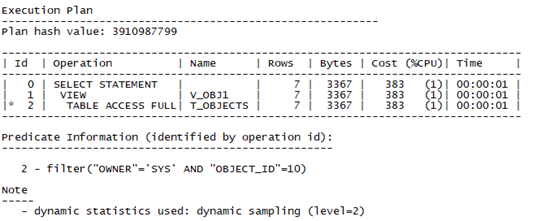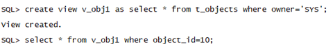 1、创建一个带有过滤条件的视图,并对这个视图进行带过滤条件的查询。在执行计划中可以看出已经没有视图对象出现。视图内部的过滤条件OWNER=’SYS’和外部的过滤条件OBJECT_ID=10都被合并在一起并转换为基表T_OBJECTS的过滤条件。