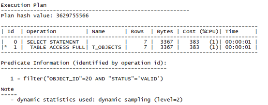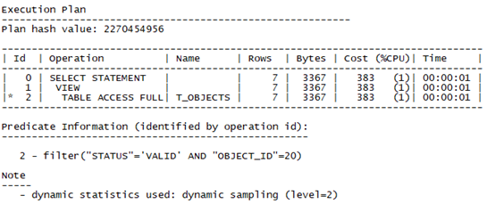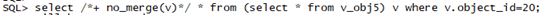 2、使用no_merge提示后我们看到在ID=1的步骤里可以看到VIEW字样,即视图没有进行合并。再看一下ID=2的步骤,由Predicate Information可见,过滤条件是STATUS=‘VALID’ AND OBJECT_ID=20。可见这里的条件不仅包括视图定义中对表的过滤条件,还包括了从外部传入的过滤条件。即过滤谓词被推入了视图定义中。