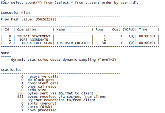 看下面查询语句中的排序不是必须的,从Statistics的Sorts部分可以看出都是0,可以看出优化器在生成执行计划时,对排序进行了消除。