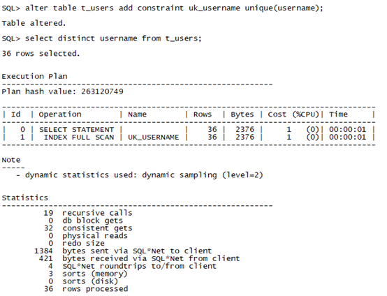 通过给T_USERS增加唯一索引后,再进行查询。通过执行计划可以看出是直接通过新增榆树UK_USERNAME的索引完成了扫描,不需要再去重了。