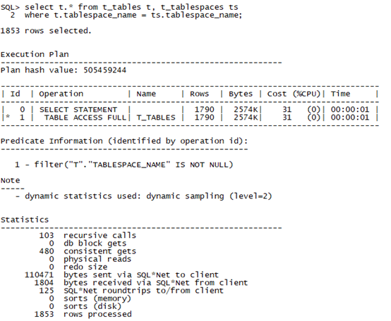 首先创建T_TABLES、T_TABLESPACES两张表,并创建他们之间的外键关系,并对T_TABLES进行查询。虽然SQL中关联到了T_TABLESPACES,但其实是不需要的。所以通过执行计划可以看到优化器对T_TABLESPACE进行了消除。