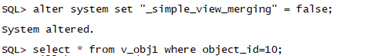 2、同修改隐含参数,不允许进行简单视图的合并。从执行计划中可以看到出现“VIEW”字样,即没有进行视图合并。