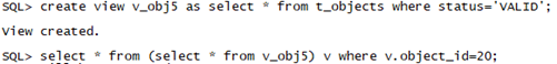 1、新建一个带有过滤条件的视图,然后进行查询。我们看到执行计划没有看到谓词推入,原因是这里采用了前面说的到视图合并。