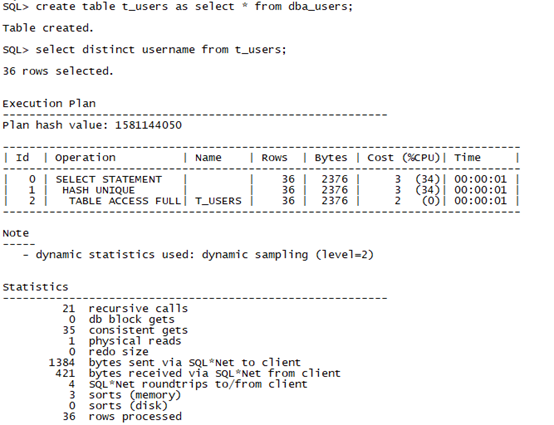 新建一张表,进行DISTINCT查询。通过下面的执行计划,可以看到默认走了全面扫描,然后用HASH进行了去重。