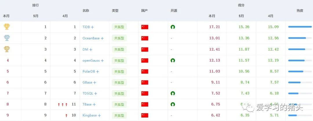 再来看看墨天轮上国产数据库的排名。前三甲分别是TiDB、OceanBase和DM。