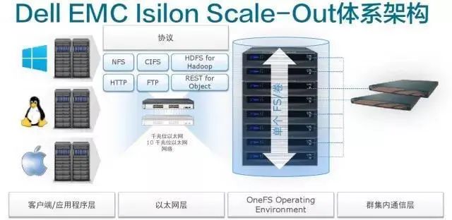Isilon存储系统采用scale-out数据湖架构设计,可以轻松实现PB级容量扩展,它原生支持多种文件协议,能够满足开发和运维的整体性与敏捷度:NFS、SMB、HDFS、Object与Rest API。