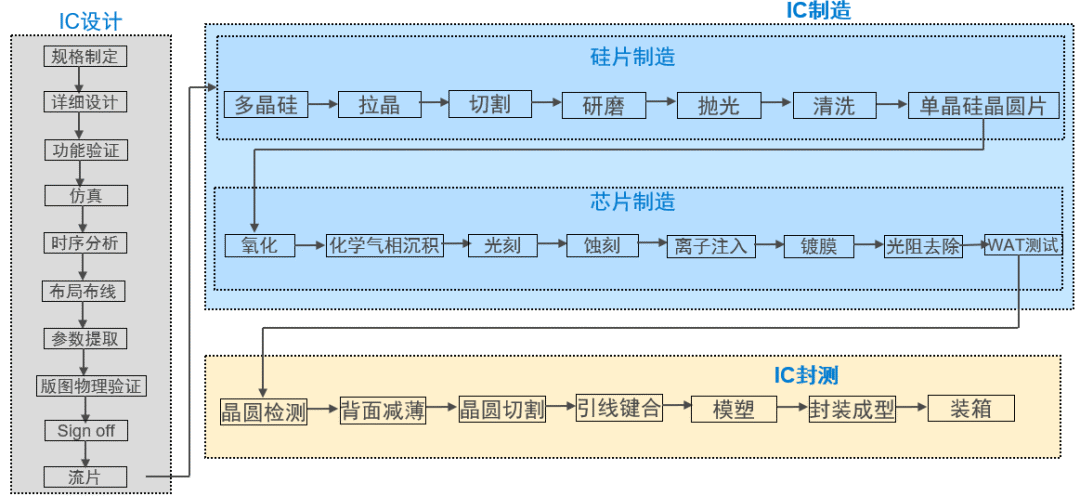 芯片制造,是一个“点沙成金”的过程,总体上分为三步,从上游的IC芯片设计,到中游的芯片制造,再到下游的封装测试,其间要经过数百道工艺的层层精细打磨,方可制成芯片成品。