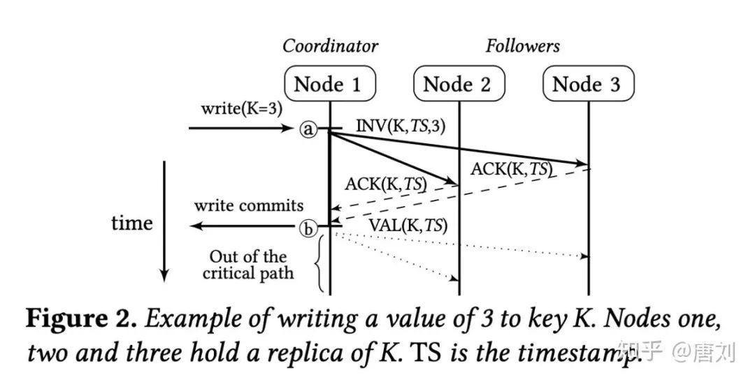 Hermes 的 replica 有 Coordinator 和 Follower 两种,Coordinator 接受 client 的写入请求,参考论文的图,一次写入如下: