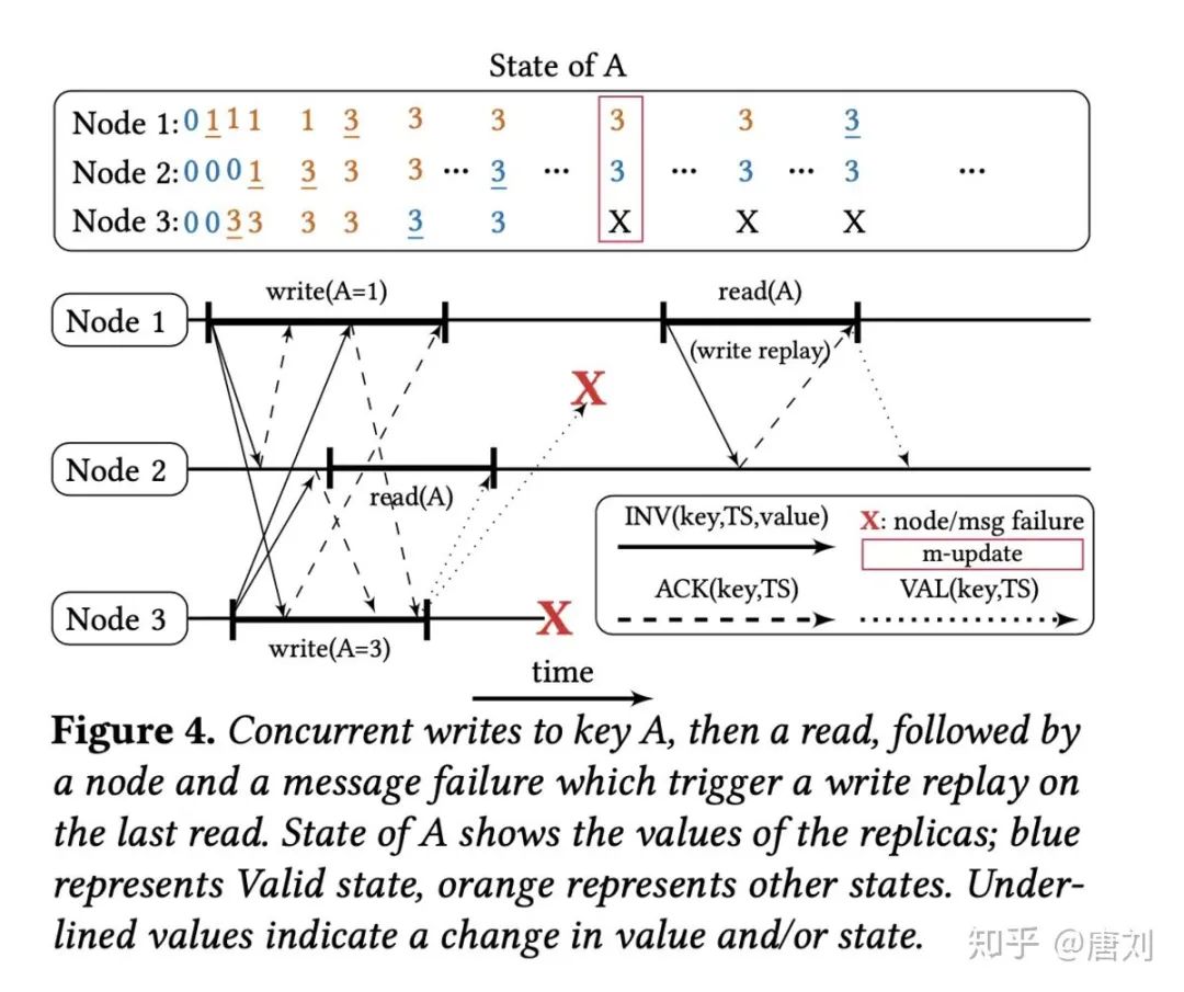 基于上述两点,任何一个节点如果发现一个 key 处于 Invalid 状态超过一段时间,就可以认为自己是 coordinator,使用之前的 LT,重新传递之前的 INV 消息,安全的 replay 这个 write。