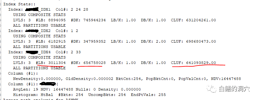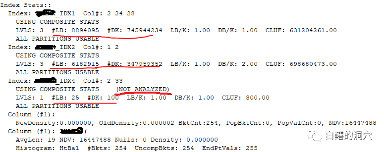 经过分析发现,表上原有索引XXXX_IDX2(账号,日期) ,为了新业务应用,新建了第三个索引 XXXX_IDX3(日期,时间戳)(原计划创建一个时间戳的索引,后来在测试中发现加上日期后应用效果更好,于是对原计划做了微调,实际上在很多实施中,微调往往也是引起问题的重要因素)。检查了DBA_PART_COL_HISTOGRAMS中的和索引相关的字段的统计数据: