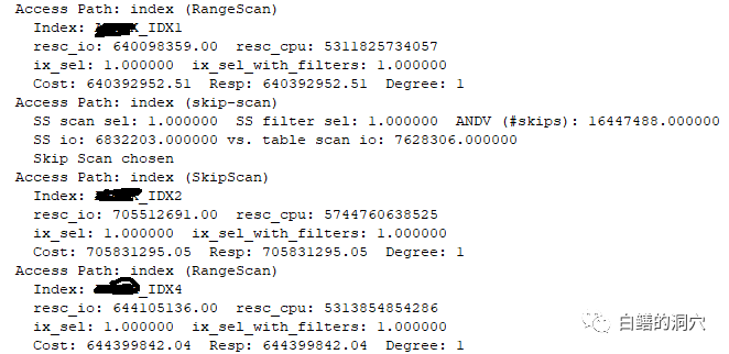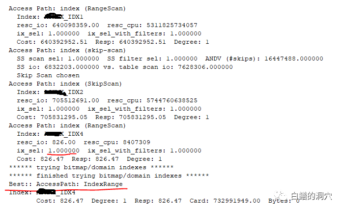 其中的IDX4是模拟实际生产环境的IDX3创建的索引。CBO计算该索引成本远低于其他索引,其COST是其他索引的85万分之一。这是十分不正常的。在TRACE里查找索引的相关属性: